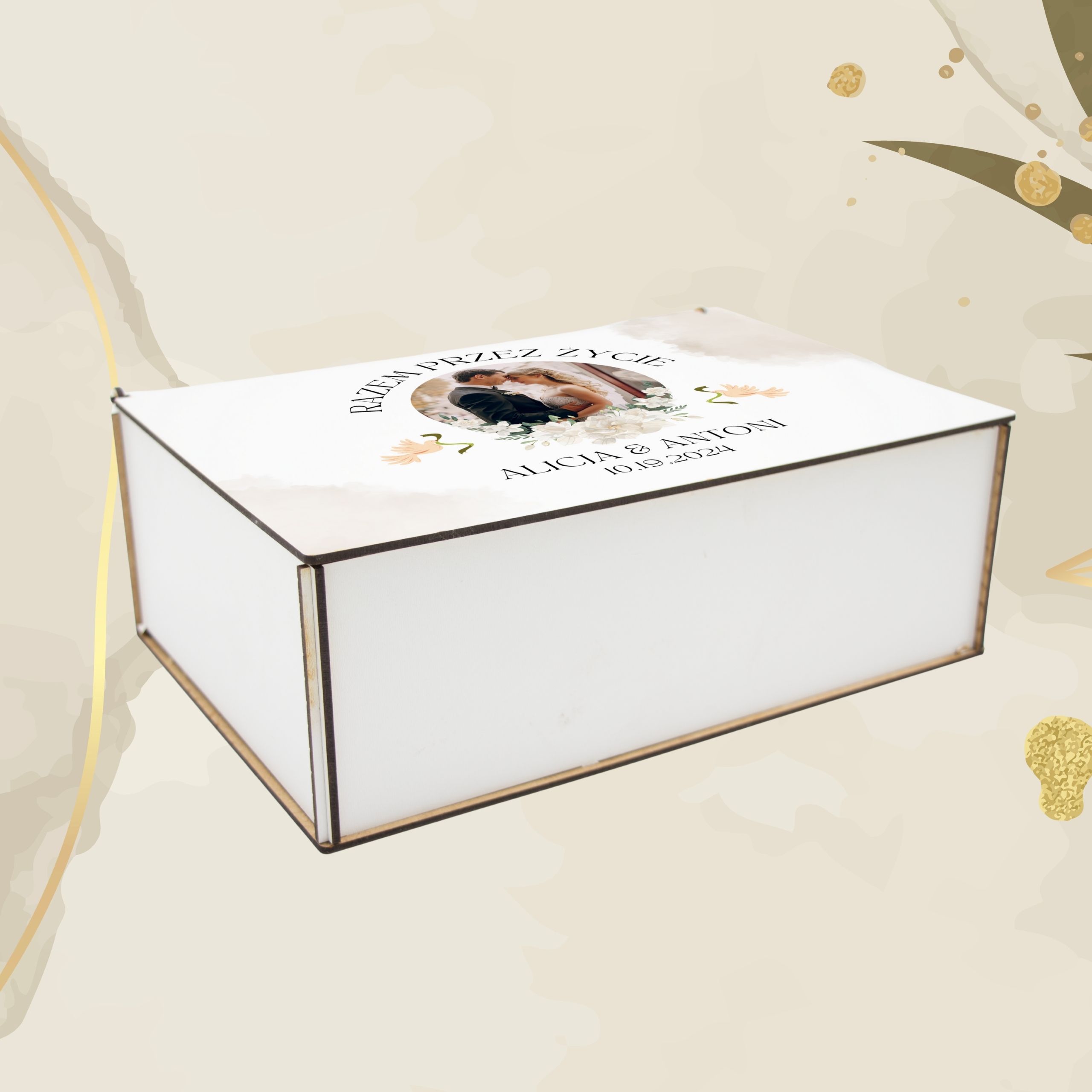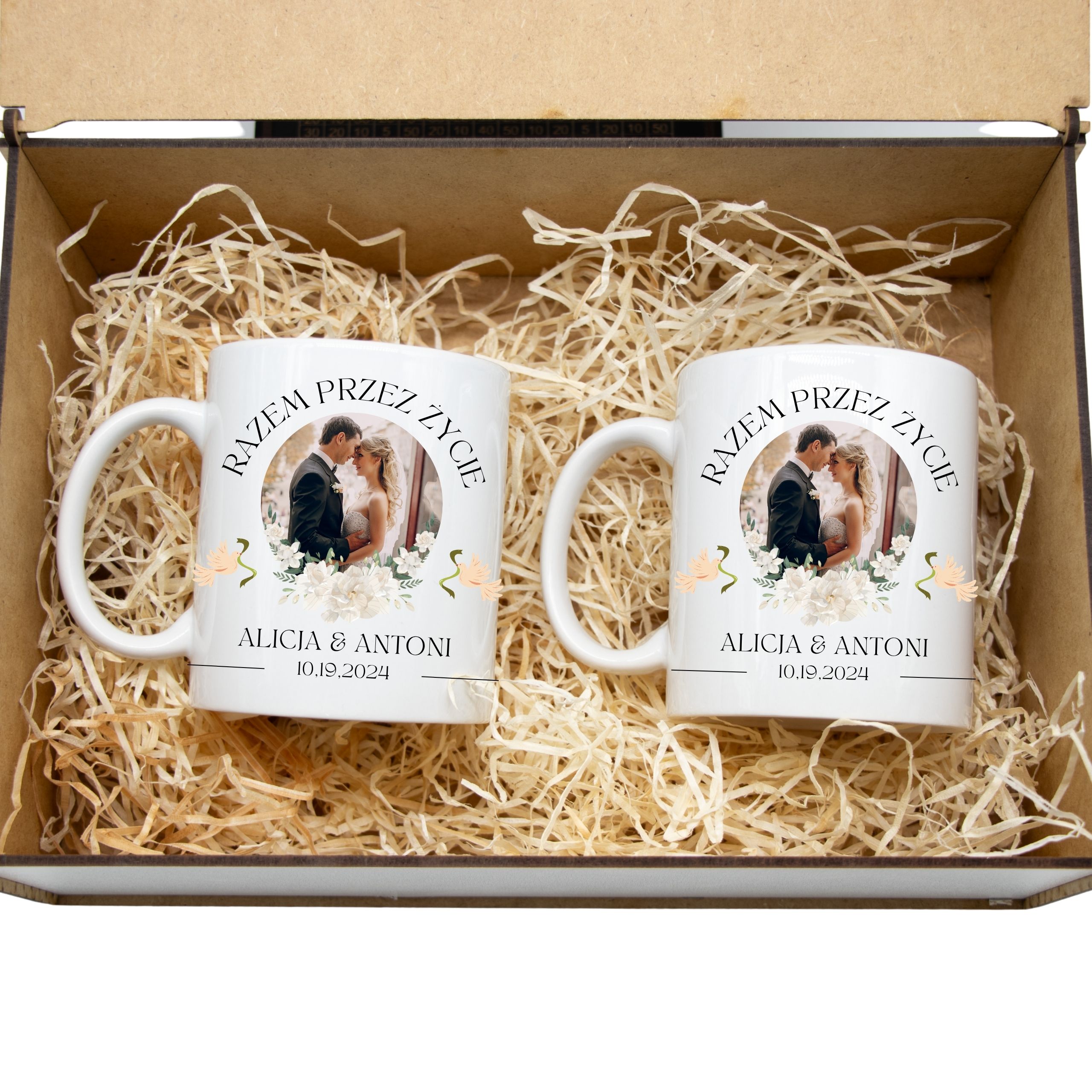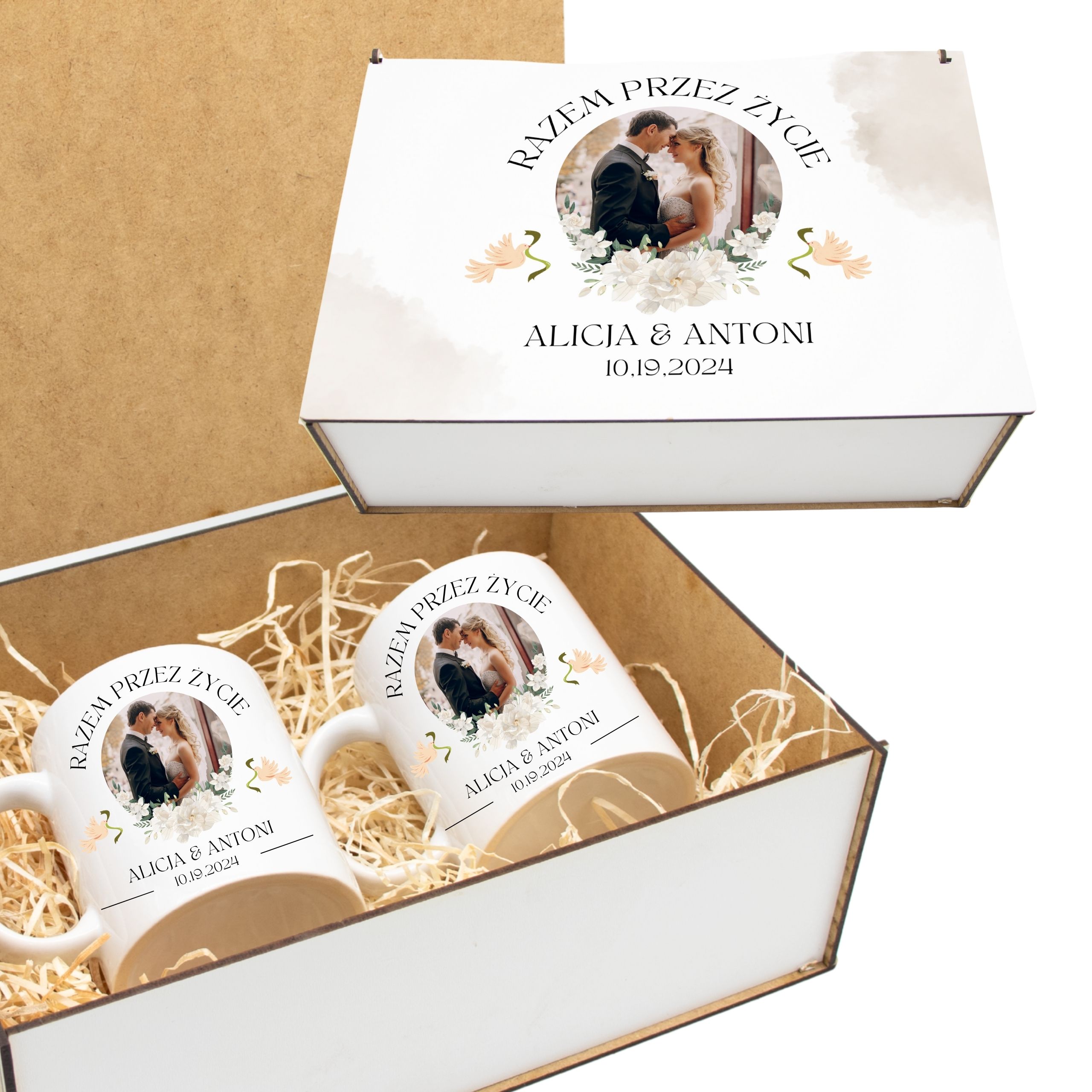 Na kubkach oraz wieczku pudełka znajduje się pełnokolorowy nadruk zdjęcia pary młodej otoczony florystyczną grafiką oraz hasłem „Razem przez życie”. Dodane są również imiona (np. Alicja & Antoni) oraz data ślubu (np. 10.19.2024) – wszystko w eleganckim, ponadczasowym stylu.